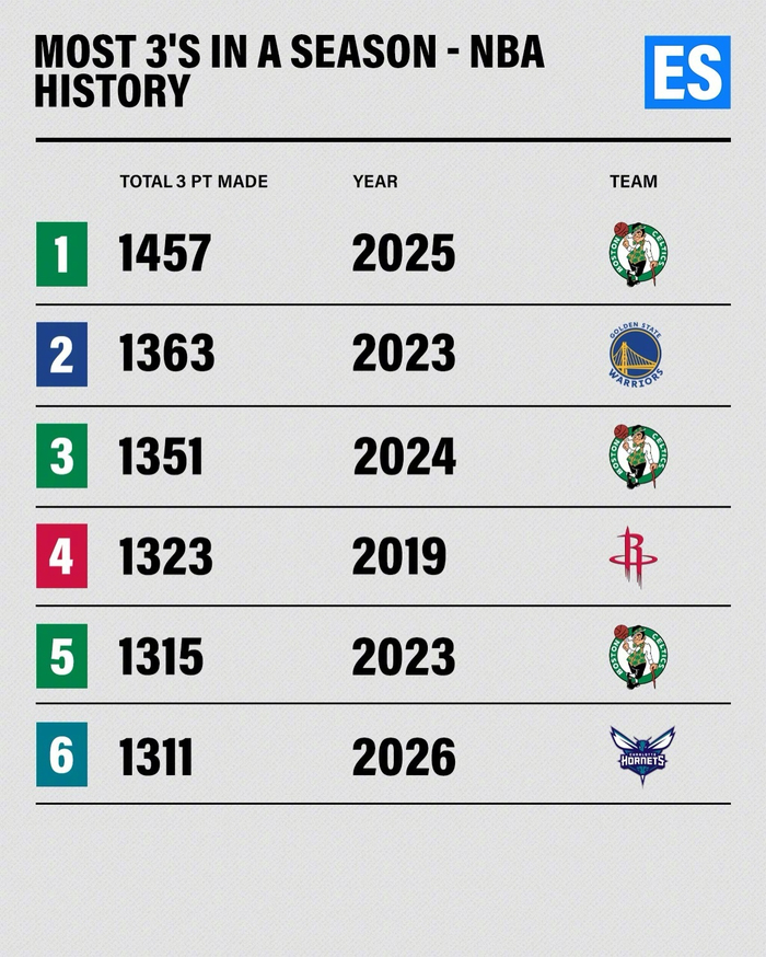 NBA历史单队命中数排名揭